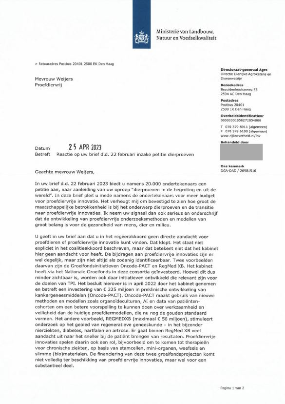 Julie handtekeningen hebben dus echt het verschil gemaakt! Ook erkent hij dat proefdiervrije methoden en modellen van groot belang is voor de gezondheid van mens, dier en milieu. Dat is een belangrijk statement om te onthouden en we hopen dan ook dat hij hiernaar gaat handelen tijdens het opstellen van de nieuwe begroting.