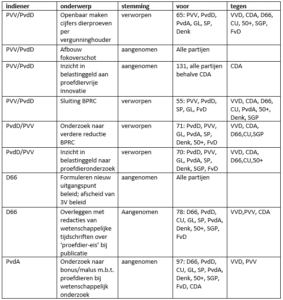 Dit gold ook voor de stemming over de PvdA motie die oproept om te onderzoeken of er een bonus/malus systeem kan worden ingevoerd bij wetenschappelijk onderzoek. Een systeem van prijsprikkels wat het werken met proefdieren ontmoedigt en proefdiervrij werken juist stimuleert. Deze motie is aangenomen.